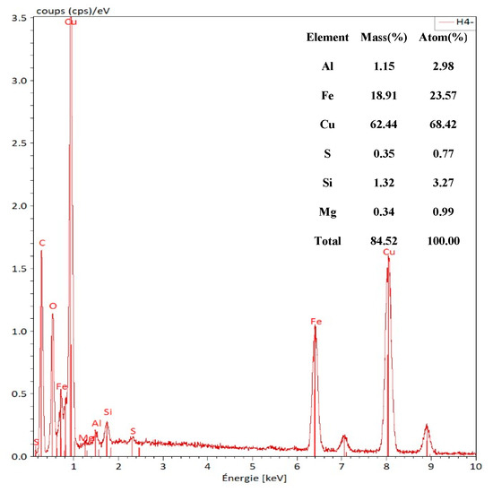 The mass concentration of Fe in the released braking aerosol can be calculated by combining the aerosol sampling efficiency, flowrate, and time. The sampling efficiency of the used TEM grid is equal to 98.14%. Knowing that the sampling flow and the sampling time are evaluated, respectively, at 0.3 L/min and 7 min, the mass concentration is estimated as: