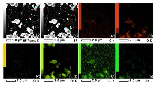 Braking particles were sampled for 7 min on the TEM grid, and 60 nm RbCl particles were subsequently deposited for 30 min, as reference. STEM-EDS analysis confirms that the braking aerosol mostly consists of Fe, as shown in Figure 10 (Cu, another present element, appears because of the supported copper grid), which is consistent with the literature [37].