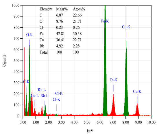 According to the EDS elemental mass ratio and the mass of Rb (see Table 5), the mass of element Fe deposited on the TEM grid is: