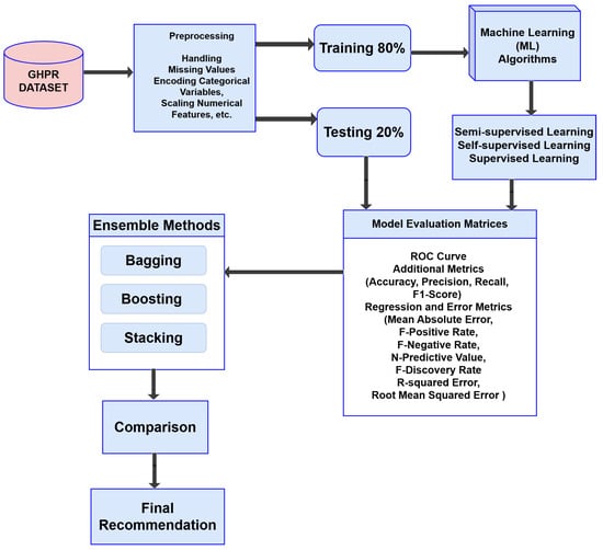 Figure 1 illustrates the process of software defect diagnosis. First, datasets were selected from Kaggle. Next, the process involved addressing scaling, numerical features, missing values, and encoding categorical variables using Min–Max scaling to standardize the features. The dataset consists of two distinct groups of data. In this study, seventeen machine learning algorithms—categorized into three types: supervised, self-supervised, and semi-supervised learning—were applied to analyze the dataset. For this research, 80% of the training data was utilized to train the model. Subsequently, the model was tested with 20% of the testing data from the datasets for both supervised and self-supervised learning. Additionally, for semi-supervised learning, a randomization process was implemented for the labeled (50%) and unlabeled (50%) data within the dataset. The analysis considered various metrics to assess the models, including mean absolute error (MAE), R-squared error (RSE), root mean squared error (RMSE), and the ROC curve. After thoroughly comparing all available options, the best-performing model was exported. Finally, ensemble techniques were applied to analyze software defects.