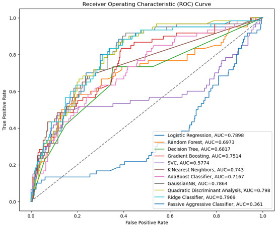 In Figure 4, the bagged ensemble model with the highest AUC is the bagged ridge classifier, with an AUC of 0.8. The model also has the greatest TPR of all false-positive rates. The bagged decision tree, bagged AdaBoost classifier, bagged passive-aggressive classifier, bagged Gaussian naive Bayes (GaussianNB) algorithm, and bagged logistic regression models all exhibit similar AUCs, ranging from 0.74 to 0.79. In contrast, the bagged support vector classifier (SVC) and bagged K-nearest neighbors (KNN) models show lower AUCs at 0.65 and 0.72, respectively.