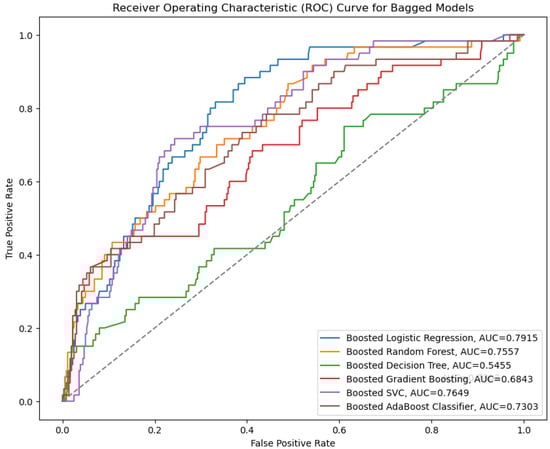 Figure 5 demonstrates that the boosted logistic regression model achieves the highest AUC (area under the curve) of 0.79, indicating that, among all the models analyzed, it performs the best overall. Below is a summary of the models’ performance based on the AUC values: The boosted SVC, boosted AdaBoost classifier, and boosted random forest models all have comparable AUCs, ranging from 0.73 to 0.76. Boosted gradient boosting has an AUC of 0.68, while the boosted decision tree has the lowest AUC at 0.56.