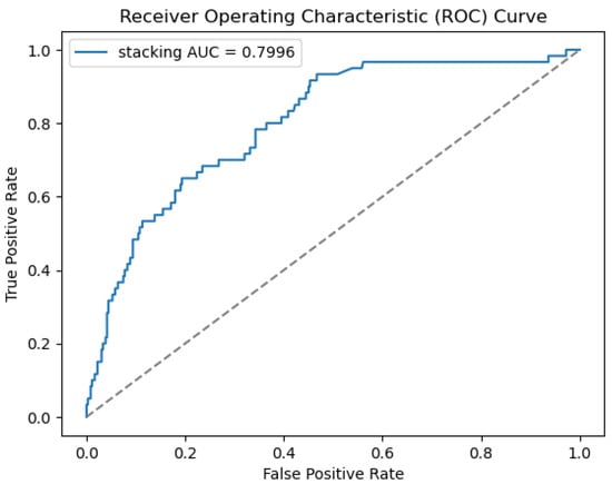 Therefore, based on the AUC, the boosted logistic regression model performs best. The boosted decision tree model has the lowest AUC, indicating undesirable performance in the distinction between positive and negative cases. On the other hand, Figure 6 shows that the stacking AUC is 0.7996. The dashed line in the plot of the ROC curve indicates the performance of a random classifier. In this case, the stacking model achieved an AUC of 0.7996, which is notably higher than the random line. This suggests that the stacking model is performing effectively.