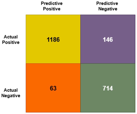 Using the confusion matrix (GB) study, we analyzed the result based on the number of true positive values (1186) true negative values (714), false positive values (63), and false negative values (146) (Figure 7). Based on the findings, the study determines the level of accuracy based on the mathematical formula (TP + TN)/(TP + TN + FP + FN). The study provides the overall accuracy of the model, which is the percentage of total samples correctly classified by the classifier.