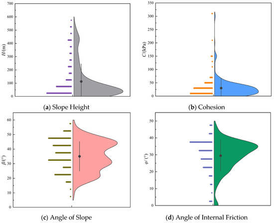 To ensure the quality and reliability of the evaluation model, 272 slope stability data samples were collected based on the six selected features, including 120 failure cases and 152 stable cases [12,13,14,15]. These samples cover various types of slopes with practical engineering backgrounds. Partial data samples are presented in Table 1. A subset of the dataset is available in the Supplementary Materials (Table S1).