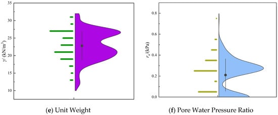 Violin plots of slope characteristics. (a) Slope Height; (b) Cohesion; (c) Angle of Slope; (d) Angle of Internal Friction; (e) Unit Weight; (f) Pore Water Pressure Ratio.