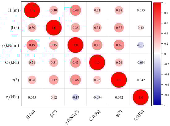 The geometric parameters, height (H) and slope angle (β), represent the morphological influence of the slope; the key physical and mechanical properties of the rock–soil mass are reflected by unit weight (γ), cohesion (C), and the internal friction angle (φ). Stability tends to increase with decreasing γ and increasing C and φ. However, a higher pore pressure ratio (ru) tends to reduce slope stability. Therefore, six indicators were selected as the input features for this study: slope height (H), slope angle (β), unit weight (γ), cohesion (C), the internal friction angle (φ), and the pore pressure ratio (ru).