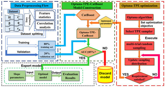 To evaluate slope stability, this study constructs an Optuna-TPE-CatBoost model with broad application potential. The area under the curve (AUC) is used as the primary optimization objective within the Optuna-TPE framework. The model construction process is shown in Figure 3: