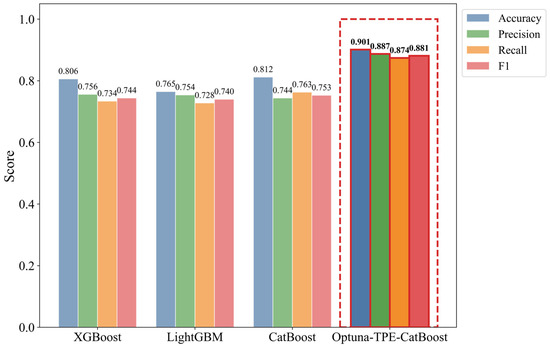 As illustrated in Figure 4, the CatBoost model optimized by Optuna-TPE outperforms all baseline models across all evaluation metrics. Specifically, it achieves a higher accuracy, precision, recall, and F1-score compared to XGBoost, LightGBM, and the unoptimized CatBoost model. Notably, all performance metrics for CatBoost exceed 0.85, indicating a significantly better predictive capability than the other three models.
