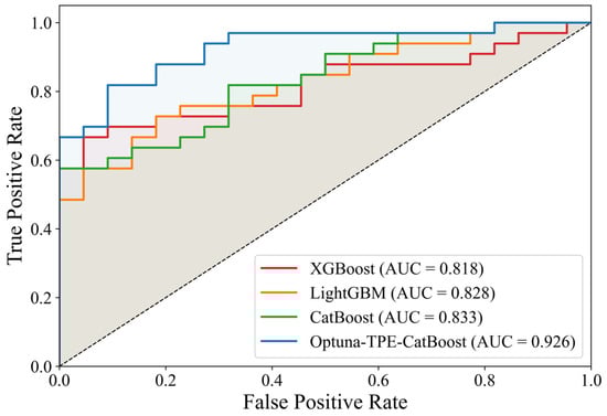 The ROC curves of the four models are presented in Figure 5, with the corresponding AUC values as follows: XGBoost (0.818); LightGBM (0.828); CatBoost (0.833); Optuna-TPE-CatBoost (0.926). Clearly, the ROC curve of the Optuna-TPE-CatBoost model is closest to the top-left corner, indicating a substantial improvement in classification performance after hyperparameter optimization.