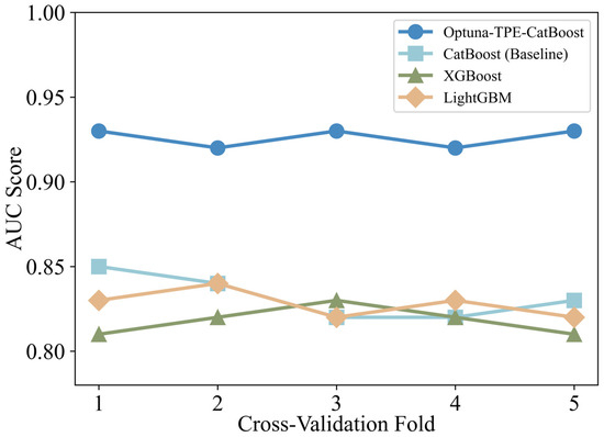 Furthermore, as illustrated in Figure 6 and Figure 7, the validation curve of the Optuna-TPE-CatBoost model consistently lies above those of the other models across all five folds, demonstrating its superior performance throughout the cross-validation process. Compared with the unoptimized CatBoost model, the optimized model exhibits a notable improvement in stability, as reflected by its lower standard deviation (0.005), compared to the range of 0.007 to 0.012 observed in the other models. This enhanced performance may be partially attributed to the integration of the auto_class_weights parameter in the CatBoost model, which dynamically adjusts class weights to mitigate the impact of data imbalance. This strategy, combined with hyperparameter optimization via Optuna, contributes to improved generalization and robustness of the model.
