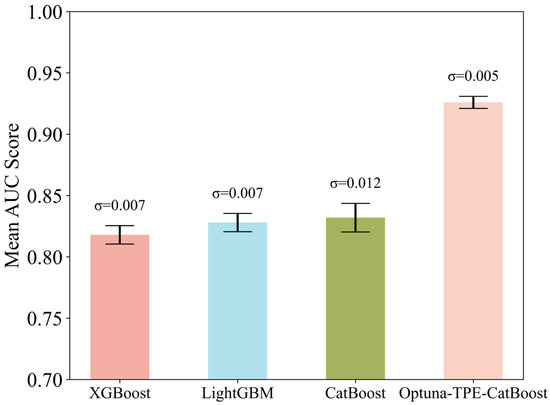 The 5-fold cross-validation results for each model are presented in Figure 6. The Optuna-TPE-CatBoost model consistently achieved validation scores above 0.90 across all five folds, outperforming the other three models, whose validation scores all exceeded 0.85. The highest individual score—excluding the optimized model—was obtained in the first fold of the baseline CatBoost. Importantly, the performance curve of Optuna-TPE-CatBoost remains consistently higher than those of the other three models, indicating its superior generalization capability. As shown in Figure 7, the standard deviations of the cross-validation results for each model are as follows: XGBoost (0.007); LightGBM (0.007); CatBoost (0.012); Optuna-TPE-CatBoost (0.005). CatBoost exhibited the highest variability with a standard deviation of 0.012, while the optimized Optuna-TPE-CatBoost model achieved the lowest standard deviation at 0.005, indicating greater consistency and robustness in its predictions.