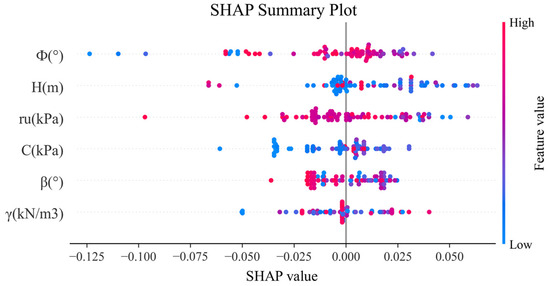 Figure 8 illustrates the SHAP summary plot for the Optuna-TPE-CatBoost model, providing insights into the contribution and direction of each geotechnical feature toward the prediction of slope stability. From a geotechnical perspective, the internal friction angle (φ) shows the strongest influence, with a wide spread of SHAP values. High φ values (red) are generally associated with positive SHAP values, indicating improved stability—consistent with the Mohr–Coulomb failure criterion. The pore pressure ratio (ru) exhibits mostly negative SHAP values, particularly at higher values, reflecting its destabilizing role by reducing effective stress. Slope angle (β) also contributes negatively, especially for steeper slopes, aligning with the increased driving force on failure surfaces. Cohesion (C) has a more dispersed impact, where high values enhance stability, but its influence is less concentrated than that of φ. Slope height (H) and unit weight (γ) show moderate effects, with taller slopes and heavier materials sometimes contributing slightly to instability. Overall, the SHAP-based sensitivity analysis confirms that the model correctly captures known geomechanical relationships and nonlinear interactions among features. From a geotechnical perspective, this is consistent with the understanding that factors such as the internal friction angle and the pore pressure ratio exert a critical influence on slope stability, and that SHAP values can effectively reveal such mechanisms in interpretable machine learning frameworks [27]. This enhances the interpretability, transparency, and engineering applicability of the proposed model, making it a reliable tool for practical slope stability assessment.