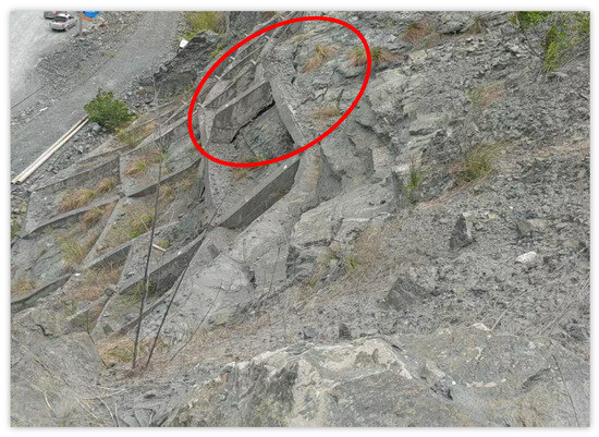 The data were sourced from published engineering reports and one real-world open-pit slope project, with no overlap with the original 272-case dataset. The ten cases were selected based on the following criteria: (1) a wide range of geological and engineering conditions; (2) well-documented stability outcomes; (3) the availability of reliable input parameters; and (4) data sourced from peer-reviewed publications and real-world projects. The selected cases were evaluated using the Optuna-TPE-CatBoost framework, and the corresponding results are summarized in Table 4. The findings indicate that the model’s predictions were fully consistent with the actual stability status of all ten slopes. Of particular note are Cases 4 and 9, which involved slope failures. Figure 9 shows the field failure pattern of Case 4, where the model accurately identified critical feature combinations, including low cohesion (C = 0 kPa) together with high pore pressure ratios (ru > 0.3). This highlights the model’s strong ability to capture the coupled interaction between strength parameters and pore water pressure, thus validating the TPE algorithm’s deep optimization of CatBoost’s feature interaction mechanism. Such optimization allows the model to identify nonlinear interactions that are crucial for assessing slope failure mechanisms.