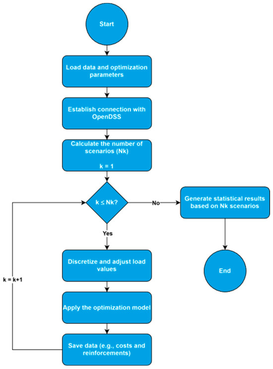 The proposed methodology follows a multi-stage framework, structured in annual stages, enabling investment allocation in reconductoring over a five-year planning horizon, starting from a designated reference year. This analysis horizon aligns with [24], which establishes the appropriate timeframe for such investments within the Brazilian regulatory framework. To incorporate load estimation uncertainties, the methodology employs Monte Carlo simulation [28], allowing a probabilistic evaluation of load variations and their impact on investment decisions. The influence of these uncertainties is assessed through the resulting investment values over the planning horizon, ensuring a more robust and data-driven decision-making framework for asset allocation in electricity distribution networks. Figure 3 presents the flowchart of the proposed algorithm.