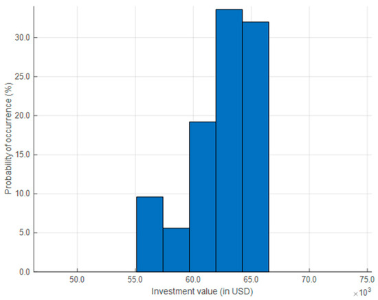 The results are organized into two parts. The first part examines the overall investment behavior across all simulated scenarios using a histogram, shown in Figure 4. The x-axis represents the total investment values in United States dollars over the five-year planning horizon, while the y-axis indicates the probability of occurrence for each value. Considering a 90% confidence interval, investment amounts range approximately from USD 56,000 to USD 66,000, which means there is a 90% probability that the investment value will fall within this range. The probability distribution is asymmetric and skewed to the right, highlighting a greater likelihood of higher investment levels. For instance, there is a 65.6% probability that the total investment will reach or exceed USD 63,000. This trend reflects a consistent growth in load that increases the risk of exceeding conductor capacities, thereby requiring more frequent reconductoring. Under these conditions, reconductoring should be considered not only from a technical standpoint but also within an economic framework, supporting more informed and strategic investment decisions.