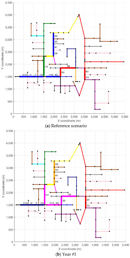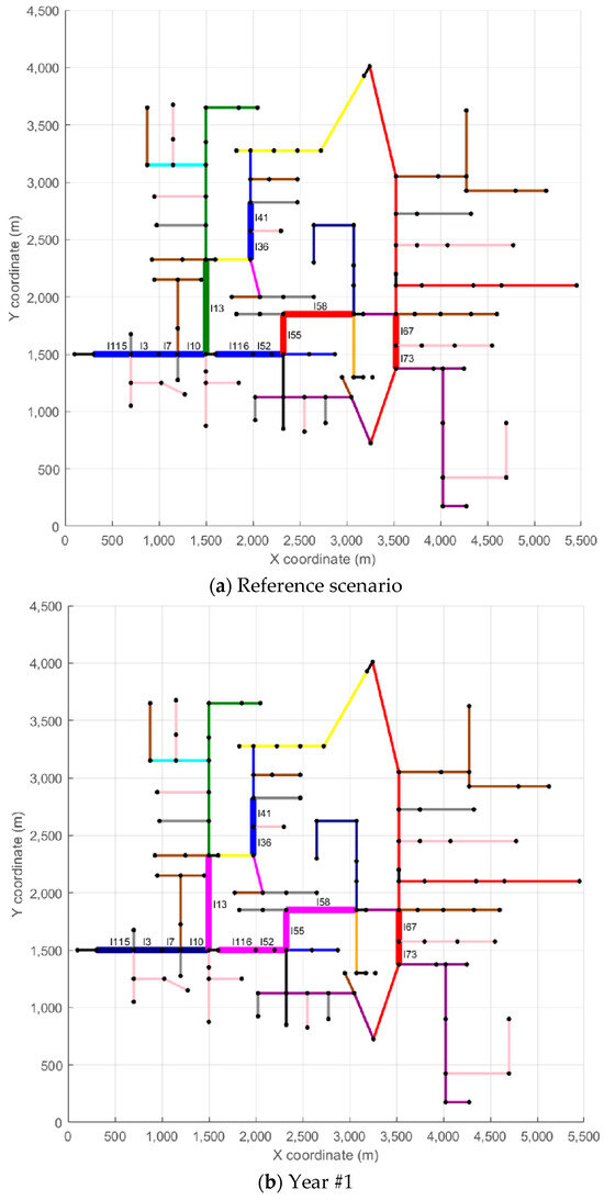 In Figure 5, Figure 6 and Figure 7, each branch is color-coded according to the type of conductor in use, as indicated in the legend. To improve clarity, branches that underwent reconductoring in at least one year appear with thicker lines and display their IDs to facilitate identification. For example, in Scenario #1, line l115 appears in light blue in the Reference Scenario (conductor CA01), while in Year #1, the same line shows in dark blue (conductor CA12), indicating the reconductoring action—in this case, replacing conductor CA01 in the Reference Scenario with conductor CA12 in Year #1. In the remaining years of the analysis horizon (Years #2 to #5), line l115 stays unchanged. Another example, also from Scenario #1, is line l67, which appears in red in the Reference Scenario and in Years #1 to #3 (conductor CA03). In Year #4, line l67 appears in orange (conductor CA05), indicating a reconductoring action from conductor CA03 to conductor CA05. Line l67 remains unchanged in Year #5. A similar analysis can be carried out for the other lines and scenarios.