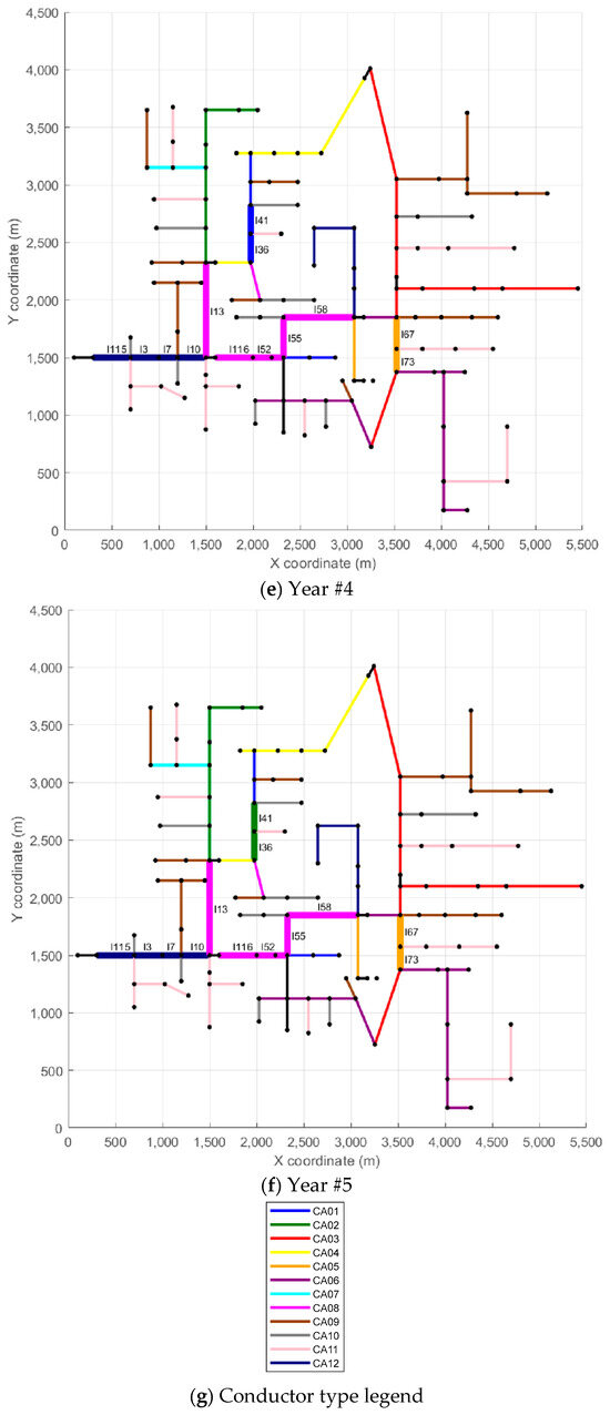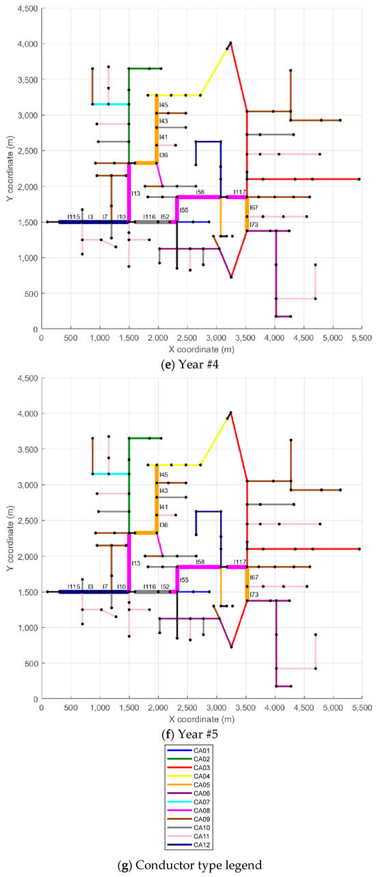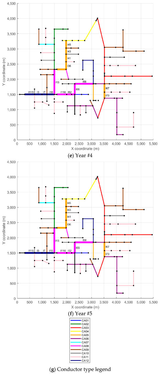 Yearly reconductoring configuration for Scenario #1: (a) reference scenario, (b) Year 1, (c) Year 2, (d) Year 3, (e) Year 4, (f) Year 5, and (g) color legend for conductor types.