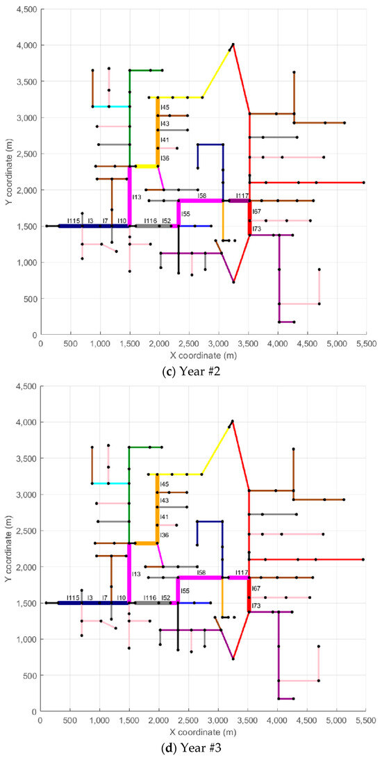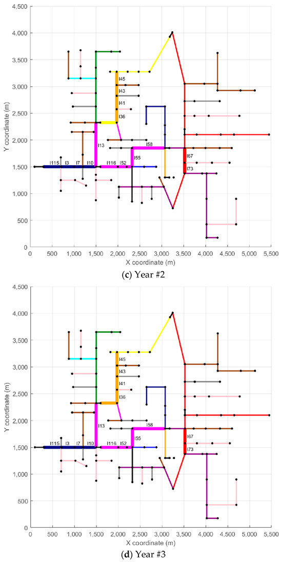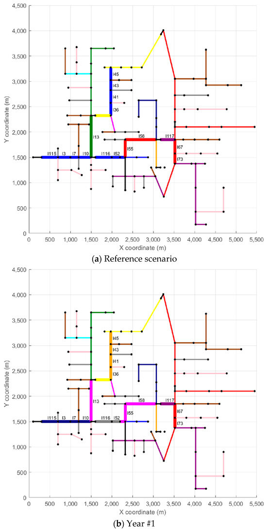 To provide more detailed insight into the reconductoring actions, each scenario also includes a table that summarizes the reconductoring measures implemented. These tables provide details on the affected branches, the year of intervention, the length of each modified section, and the corresponding investment cost. The reconductoring actions carried out in Scenario #1 are presented in Table 2, those related to Scenario #96 are shown in Table 3, and those for Scenario #125 are included in Table 4. Returning to the examples of lines l115 and l67, both from Scenario #1, Table 2 indicates that line l115 measures 121.92 m and has a reconductoring cost of USD 9437 (Year #1), while line l67 has a length of 83.82 m with a reconductoring cost of USD 1068 (Year #4).