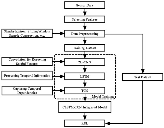 The CLSTM-TCN model follows a systematic workflow spanning data preprocessing, feature extraction, and model training, designed to convert raw sensor data into reliable RUL predictions. The process is structured into six key steps: