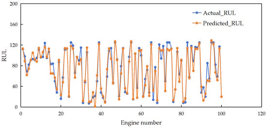 The hybrid CLSTM-TCN model achieves an RMSE of 13.35 and a score of 219 on the test data set, demonstrating strong predictive performance. Figure 4 visualizes the RUL predictions for all 100 engines in the test set, providing a comprehensive overview of the effectiveness of the proposed methodology. As observed in the figure, the predicted RUL values closely align with the actual degradation trajectories for most engines, with only minimal discrepancies across most operational cycles. This widespread consistency confirms the feasibility of the CLSTM-TCN model in capturing aeroengine degradation patterns and validates its effectiveness for RUL prediction.
