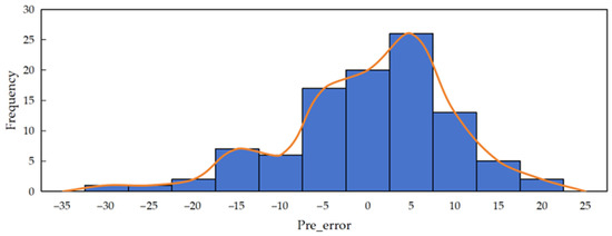 To further quantify the prediction performance of the model, a statistical analysis of the engine RUL prediction errors was conducted, with the results presented in Figure 5 (a histogram of prediction errors). The figure reveals that the distribution of RUL prediction errors approximates a normal distribution (comprehensive statistical tests will be conducted in future research), with most of the errors concentrated within the interval [−20, 20]. This narrow error range, combined with the near-normal distribution, indicates that the prediction biases of the model are randomly distributed rather than exhibiting systematic skewness. Such characteristics further underscore the reliability and stability of the proposed CLSTM-TCN framework for aeroengine RUL prediction.