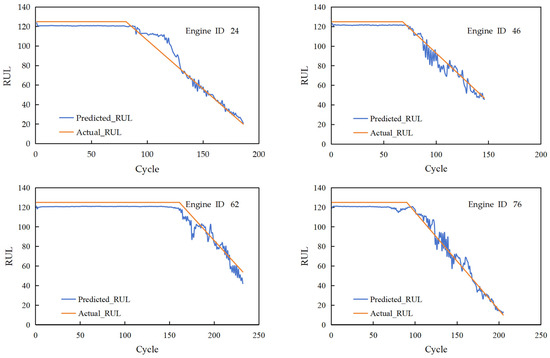 To validate the predictive performance of the proposed CLSTM-TCN model, four engines (IDs 24, 46, 62, and 76) were randomly selected from the test data set, with their RUL prediction results shown in Figure 6. As clearly illustrated, for all four engines, the predicted RUL curve (blue line) exhibits high consistency with the actual degradation trajectories (orange line) throughout the operational cycles. Notably, in the late stages of the engines’ life (i.e., when RUL approaches 0), the predicted curve shows minimal fluctuations and closely aligns with the actual RUL, effectively capturing the accelerated degradation trend in the final phase. This tight alignment not only confirms the CLSTM-TCN model’s accuracy in modeling late-stage degradation dynamics but also underscores its practical value. By reliably predicting the Remaining Useful Life in the critical late phase, it can provide precise insights for formulating timely and effective maintenance strategies for turbofan engines.