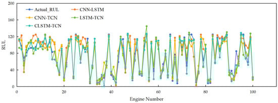 To further validate the superiority of the CLSTM-TCN model, the results were compared with published methods [20,25,26] (Table 5), where the best results are highlighted in bold. As shown in Table 5, the CLSTM-TCN model, with an RMSE of 13.35 and a score of 219, demonstrates significant superiority over other comparative models. Specifically, compared with the CNN [20] (RMSE = 18.42, score = 906), the CLSTM-TCN model achieves a 38.0% reduction in the RMSE and a 313.7% reduction in the score; relative to DBN [25] (RMSE = 15.04, score = 334), it reduces the RMSE by 15.6% and the score by 52.5%; versus the CNN-LSTM model [20] (RMSE = 16.36, score = 443), it brings about a 22.5% decrease in the RMSE and a 102.3% decrease in the score; and compared with the LSTM network [26] (RMSE = 16.14, score = 338), it yields a 20.9% reduction in the RMSE and a 54.3% reduction in the score. These results fully confirm the notable advantages of CLSTM-TCN in aeroengine Remaining Useful Life (RUL) prediction.