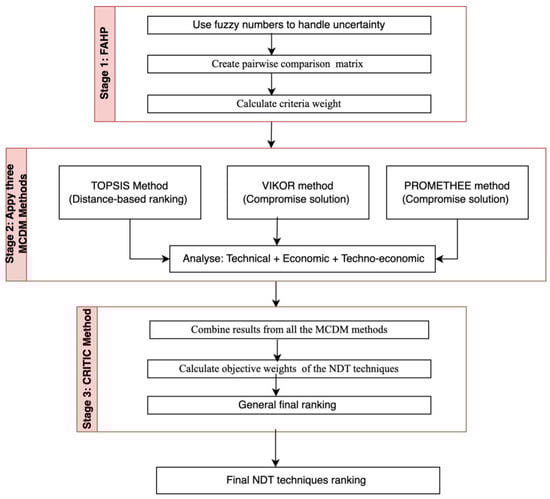 The above-mentioned knowledge serves as the motivation of this study, which presents a decision support framework that integrates technical and economic factors to guide optimal inspection decisions in the oil and gas industry. The framework uses a multi-criteria decision-making (MCDM) approach, specifically Fuzzy Analytic Hierarchy Process (FAHP), TOPSIS (Technique for Order Preference by Similarity to Ideal Solution), PROMETHEE (Preference Ranking Organization Method for Enrichment of Evaluations), and VIKOR (VIseKriterijumska Optimizacija I Kompromisno Resenje)—i.e., Multi-criteria Optimization and Compromise Solution and CRITIC (CRiteria Importance Through Intercriteria Correlation) to rank the NDT methods for analyzing and optimizing welding and coating inspection processes. The framework has a structured methodology to handle the complexity of decision-making under fuzzy conditions.