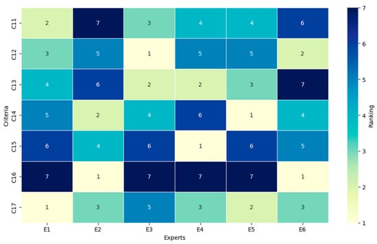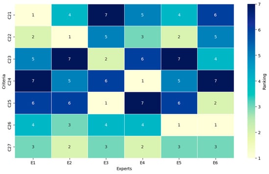 Figure 3 shows the heatmap for the economic criteria ranking by the experts. This map showed that the rank of C22 (operational cost) across most experts’ judgments (especially E2 and E1) was consistently high. C26 (recalibration costs) performed very well according to E5 and E6 (both ranked 1st). C25 (training investment) had a top rank in E3, but lower rankings in others, while C24 (inspection time) was top-ranked by E4. The results for C23 (personnel requirements) and C27 (downtime costs) were moderately ranked overall. Lastly, C21 (equipment capital cost) was highest by E1 but much lower in E3.