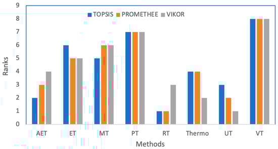 Due to the inconsistency in the ranking, this study used the CRITIC method to aggregate the outputs MCDM method outputs. Table 13 shows the CRITIC method’s outputs. This research used Equations (35)–(39) to generate the scores in Table 13. According to the CRITIC method principle, a method with a high score is more suitable than a method with a lower score. Therefore, it could be deduced that RT is the most suitable technique—this result is consistent with the TOPSIS and PROMETHEE methods’ results in Figure 4. The CRITIC method ranks for VT and the other MCDM methods’ results for VT are the same. VT was ranked as the least suitable technique. The difference in the MCDM method’s results is due to the computational approach employed by each method for ranking.