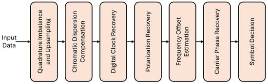 Adjusting for polarization mode dispersion (PMD) and chromatic dispersion (CD) is a significant difficulty in PM-QPSK coherent optical systems. The computational overhead of traditional time-domain equalization (TDE) increases with data rates, despite its effectiveness [17]. One alternative is overlap frequency domain equalization (OFDE), which processes signals in the frequency domain and offers a reduction in computational complexity. With this method, CD may be compensated for effectively through block processing without seeing a major drop in performance [18]. Recent advances integrate OFDE within CO-OFDM systems, enabling dynamic DSP-based compensation for both CD and PMD at high data rates [19]. Additionally, density matrix-based PMD monitoring [20] and AI-driven joint impairment compensation using parametric networks [21] further improve system robustness and efficiency. The general block diagram of DSP processes in a PM-QPSK receiver is illustrated in Figure 1.