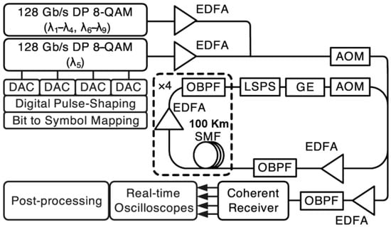Experimental set-up. DAC = digital-to-analog converter; EDFA = erbium-doped fiber amplifier; AOM = acousto-optic modulator; OBPF = optical bandpass filter; LSPS = loop synchronous polarization scrambler; GE = gain equalizer.