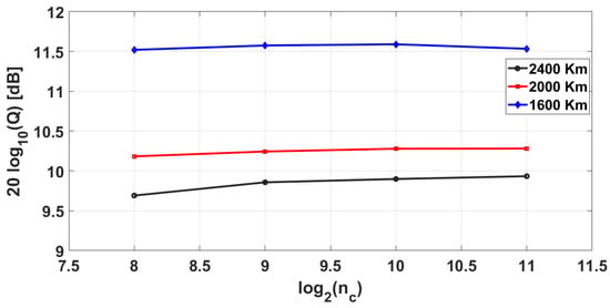 Further analysis involved varying FFT block lengths from 256 to 2048 samples with a fixed overlap length of 128 samples for distances of 1600 km, 2000 km, and 2400 km. The results are shown in Figure 5, indicating that OFDE performance marginally improved with longer FFT blocks at fixed overlap lengths.