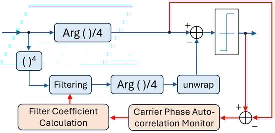 To address these limitations, a frequency offset estimation step, as shown in Figure 1, is typically applied prior to CPR. However, XPM remains a significant nonlinear effect that limits long-haul transmission performance in dense wavelength-division multiplexed (DWDM) systems. XPM-induced phase noise is influenced by various factors such as the dispersion, data rate, and especially launch power. Yan et al. introduced an XPM monitor based on a mean-squared differential phase (MSDP) estimator, which accurately determines XPM autocorrelation with minimal complexity [23]. This XPM monitor can dynamically adjust filter coefficients for optimal phase noise mitigation, enhancing the basic V-V algorithm, as illustrated in Figure 7.