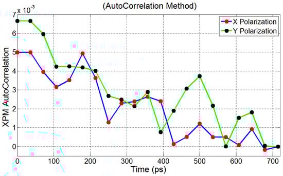 Autocorrelation of XPM noise for 2400 km transmission using the autocorrelation method.