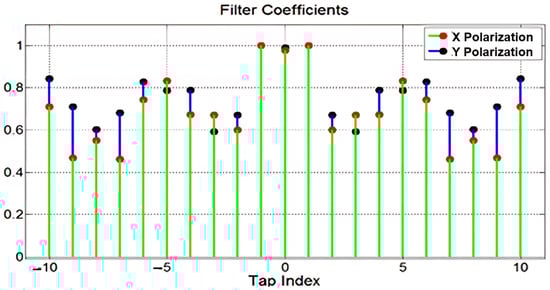 These findings show that in long-haul dual-polarization optical transmission systems, the generally accepted independence of polarization noise does not always translate into appreciable performance improvements in low cross-phase modulation (XPM) regimes. Even when the XPM effects are minimal, nonlinear interactions cause residual correlations between polarization components, as demonstrated by García-Gómez and Kramer [34]. This may be seen in the nonzero ideal filter coefficients at the tap weights’ edges, which are characteristic of single-channel transmission situations when nonlinear crosstalk is not present.