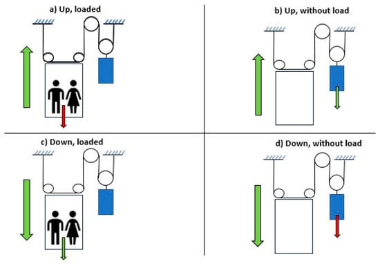 From an operational perspective, the elevator’s energy demand varies according to four fundamental movement scenarios (Figure 4), determined by travel direction and load condition. Maximum energy consumption occurs when the motor actively lifts the heavier side of the system, when ascending with full load or descending with minimal load, whereas minimal energy is consumed when gravitational forces favour movement, requiring only controlled braking by the motor, in case of descending with full load or ascending with minimal load.