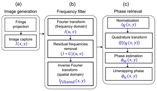 The overall methodology is structured in three main stages: fringe projection, frequency filtering, and phase recovery. This workflow allows for a systematic transition from image acquisition to accurate surface profile reconstruction, as illustrated in Figure 1.