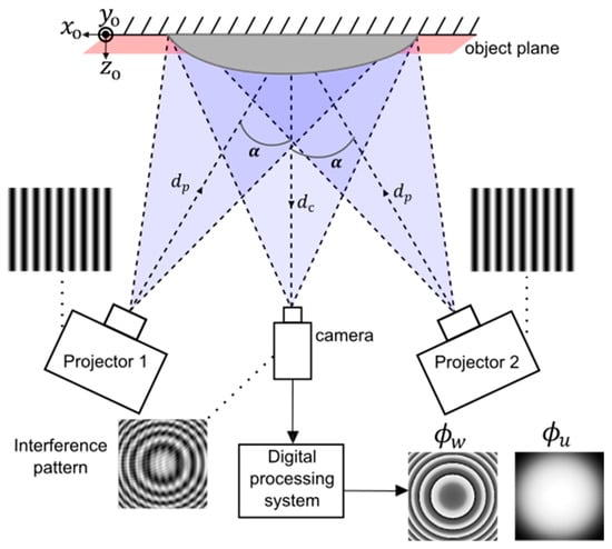 The double fringe projection technique finds applications in mechanics, where it is used for vibration analysis, strain, and displacement measurements []; in engineering and image processing for three-dimensional surface reconstruction []; as well as in biomedicine [], among other fields. This technique is distinguished by its high reproducibility and ease of use, which stem from its inherent characteristics. It features simple calibration, employs cost-effective components, and the fringe patterns are digitally managed. Additionally, the absence of mechanical components helps minimize systematic errors.