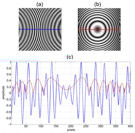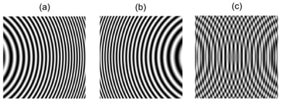 Figure 3a,b depict two synthetic sinusoidal fringe patterns with different deformations according to each side of the optical axis. Figure 3c presents the superimposed intensity.
