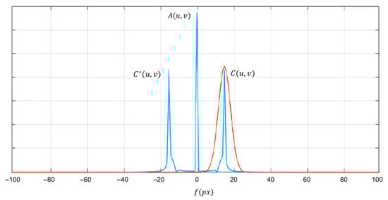 is a unit amplitude. The media (μu,μv) and standard deviation values (σu,σv) indicate the center and width of the Gaussian distribution, respectively. The filter is convolved with the intensity in the frequency domain of the image I(u,v). By removing the terms A(u,v) and C′(u,v), only C(u,v) remains. Therefore, the resulting filtered intensity can be expressed as follows: