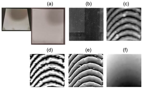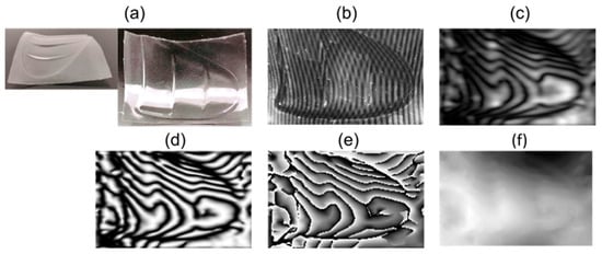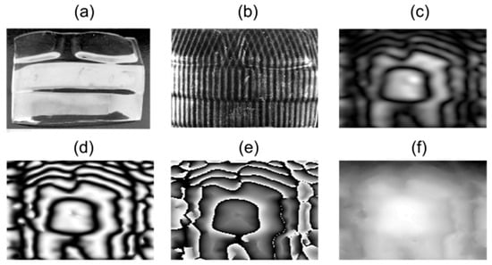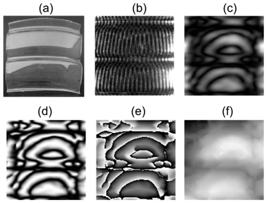 The captured images show modulation in the fringes according to the shape. These display an intensity pattern and can be expressed by Equation (2). Through digital processing using fringe analysis techniques [,], phase information is obtained, enabling the displacement analysis of the object.