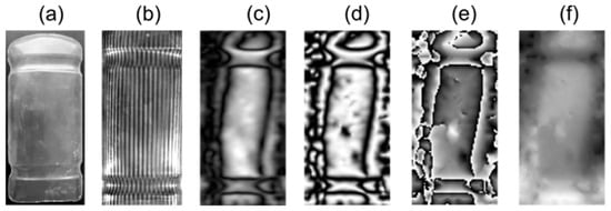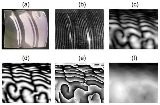 Processing results for sample 5 of a transparent plastic bottle fragment. (a) Sample object; (b) overlapped fringes in the object; (c) Moiré pattern; (d) normalized pattern; (e) wrapped phase; (f) unwrapped phase.