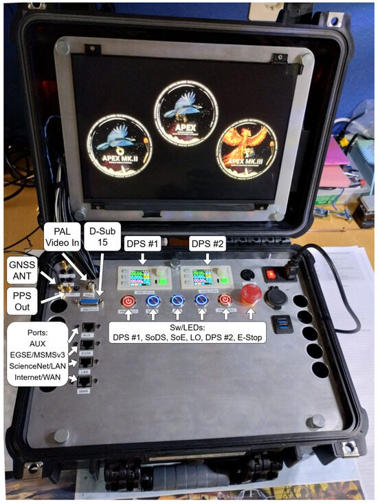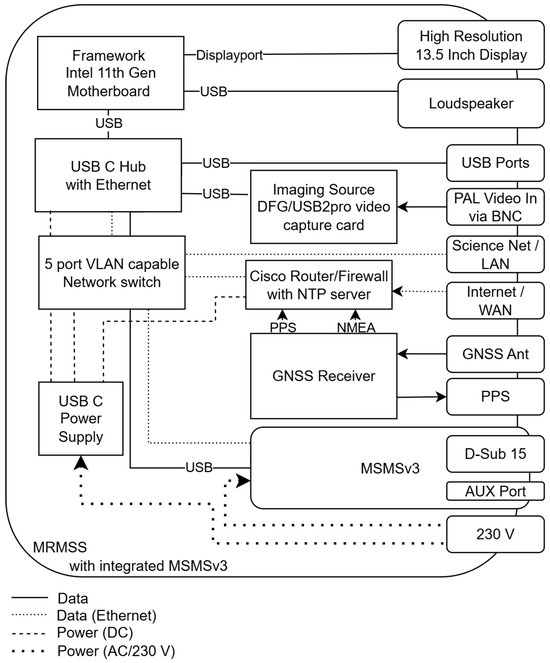 To support the software components, the top case includes a Framework Intel 11th Gen motherboard, a USB-C hub with networking interface, a 13.5 inch high resolution (2256 × 1504 pixel) display, speakers, and an Imaging Source DFG/USB2pro video capture card. The bottom case integrates a USB-C power supply, a Cisco router/firewall solution, a GNSS receiver with external antenna and PPS output, and a VLAN-capable managed switch. The GNSS receiver is also used as a source for the NTP time server running on the Cisco. Additionally, the complete MSMSv3 including three signal buttons with LED rings, two buttons with LED ring for manual control of the two DPS, two RK6006 DPS, one emergency power off button, and the power supply are included in the bottom case. According to the mission needs, additional features can be retrofitted, including an SDR solution to receive and decode weather balloon data and an LTE modem to achieve mobile connectivity, alongside other accessories like headsets, cameras, and cryptography tokens.
