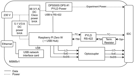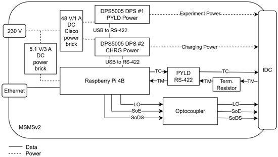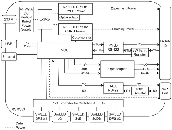 The first MSMS was created during the initial apex hardware assembly and, like apex, was built by hand on perfboard to allow for quick modifications. It used an Insulation Displacement Connector (IDC) instead of the required male D-Sub 15 connector since the apex was not directly connected to the SM but via an internal connection to the CellFix II experiment [11]. Charging power was not needed; so, MSMSv1 only exposed payload power in the form of a programmable RS485 connected Digital Power Supply (DPS) 5005 (Joy-IT, Neukirchen-Vluyn, Germany) [12] fed by a 48 V, 1 A Cisco Power over Ethernet (PoE) power brick. For signals, a control circuit using a four port optocoupler and assisting transistors were furnished to allow switching by a 3.3 V Transistor–Transistor Logic (TTL) level system. Finally, the RS-422 interface was realized using a high-speed RS-422 to RS-232 3.3 V TTL level driver and the needed termination resistor. The overall system was controlled by a RPi Zero W, which was outfitted with a USB hub, USB Ethernet controller, and USB RS485 interface to connect to the Modbus-controlled DPS 5005. A video capture card was not included in this first iteration. See Figure 2 for the block diagram.