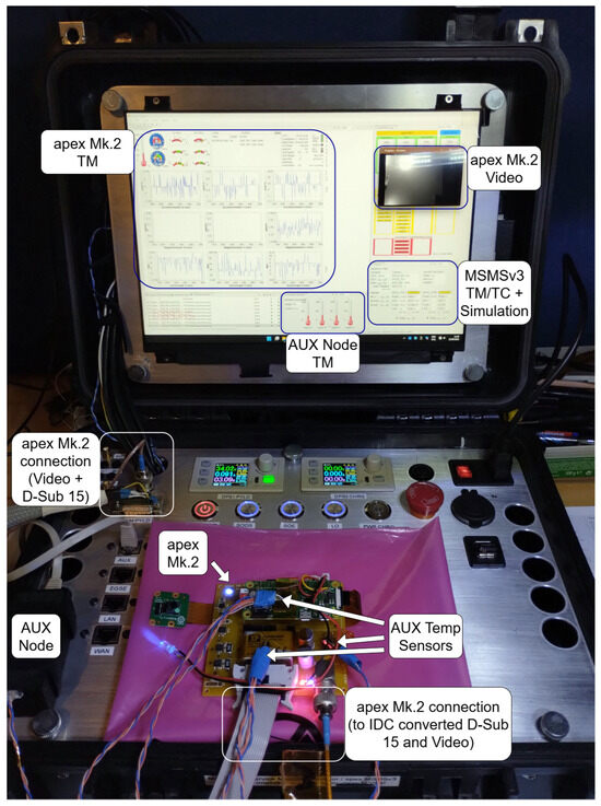In case of testing campaigns, MRMSS can use the MSMSv3 and its internal video capture card to give a flight-like simulation using the flight-hardware for operator training or hardware testing (see Figure 7). It can simulate automated timelines via the Yamcs Studio Displays and scripts to allow for repeated or automated testing. If need be, tailored AUX nodes can be used to gain additional insights into the flight hardware and measure additional parameters like temperatures of specific components or acceleration forces during shaker tests.