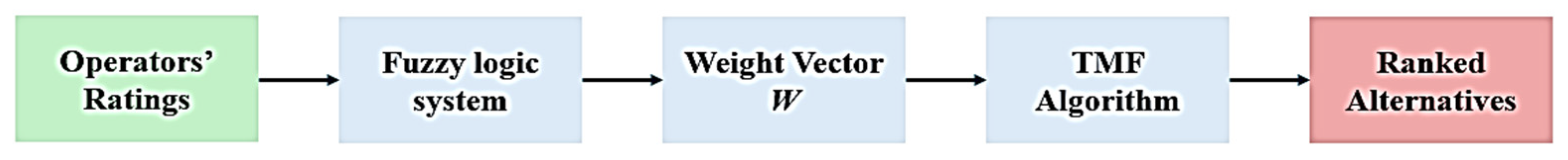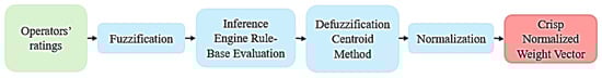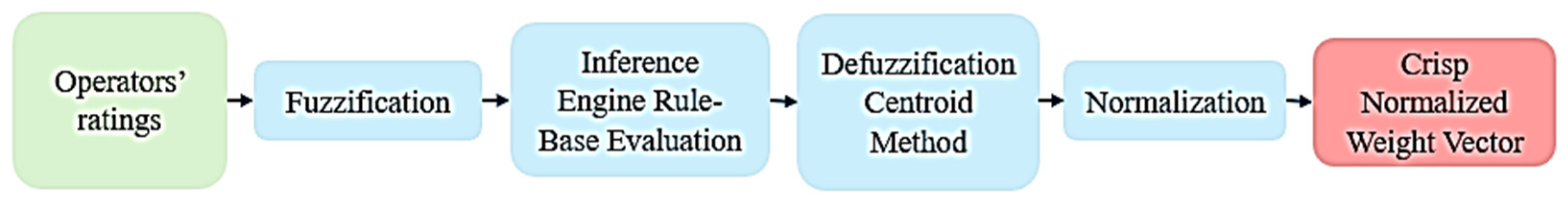 27]. The Fuzzy Logic Module was designed to function as a dedicated module that translates imprecise operator preferences into a set of crisp, normalized weights for MCDM. The primary objective is to bridge the gap between the operator’s judgment and the quantitative data required by MCDM algorithms. The overall workflow, encompassing fuzzification, inference, and defuzzification, is illustrated in