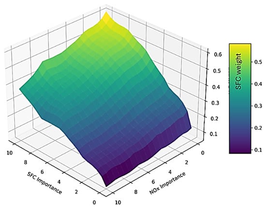 Most importantly, the surface clearly visualizes the “Competitive Mediation” principle encoded in the rule base. When both SFC and NOX importance are simultaneously high, the system actively suppresses their individual weights to prevent either criterion from dominating unrealistically. Instead of reaching extreme values (>0.7), the SFC weight plateaus at approximately 0.35–0.45, ensuring balanced consideration of both competing priorities.