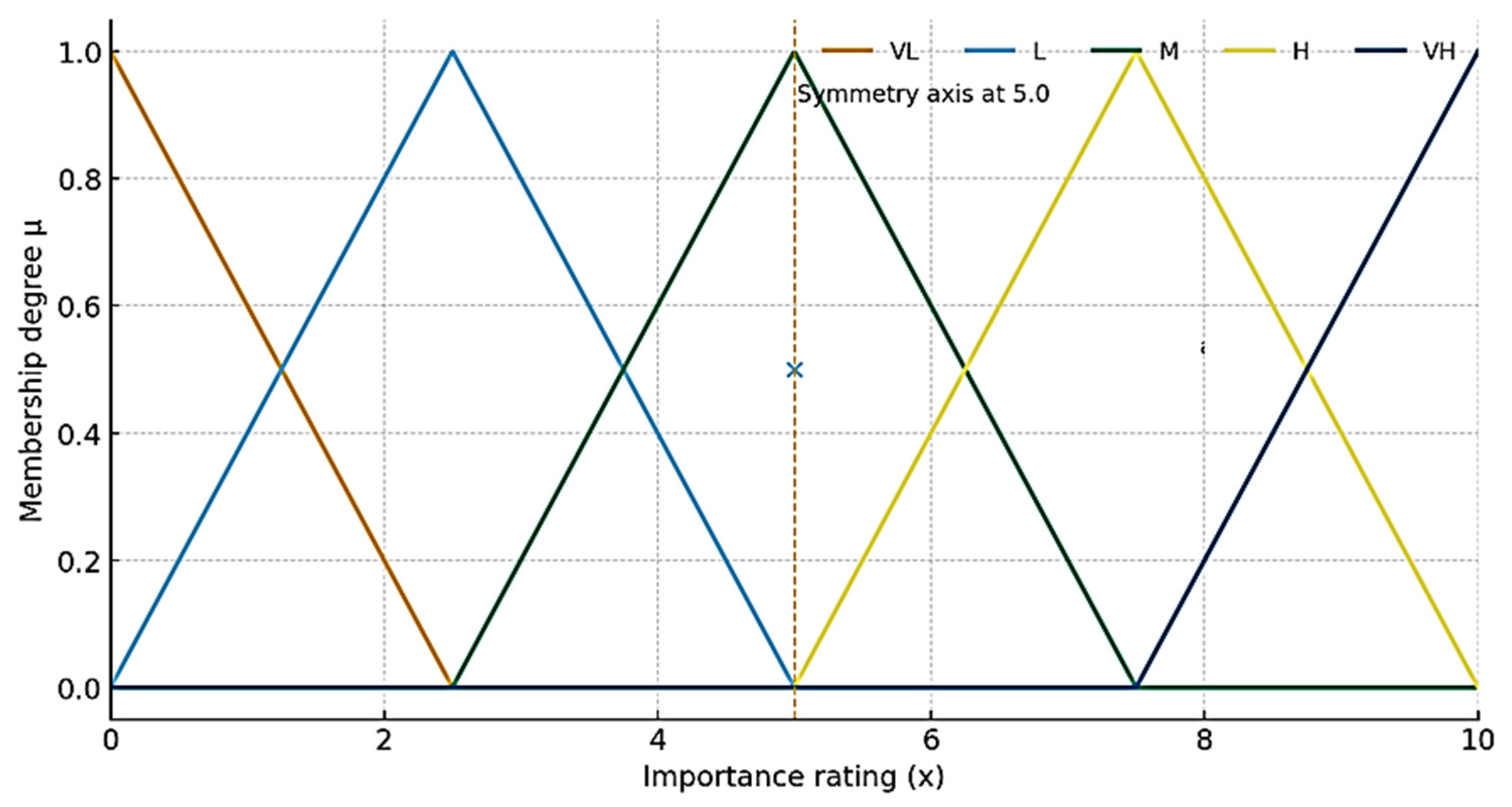 All variables share a continuous universe of discourse [0,10], representing the full scale of importance from negligible importance to maximum importance. Each input variable is divided into five linguistic terms: Very Low (VL), Low (L), Medium (M), High (H), and Very High (VH). The Triangular Membership Functions (MFs) were selected for their computational efficiency, interpretability, and robustness [